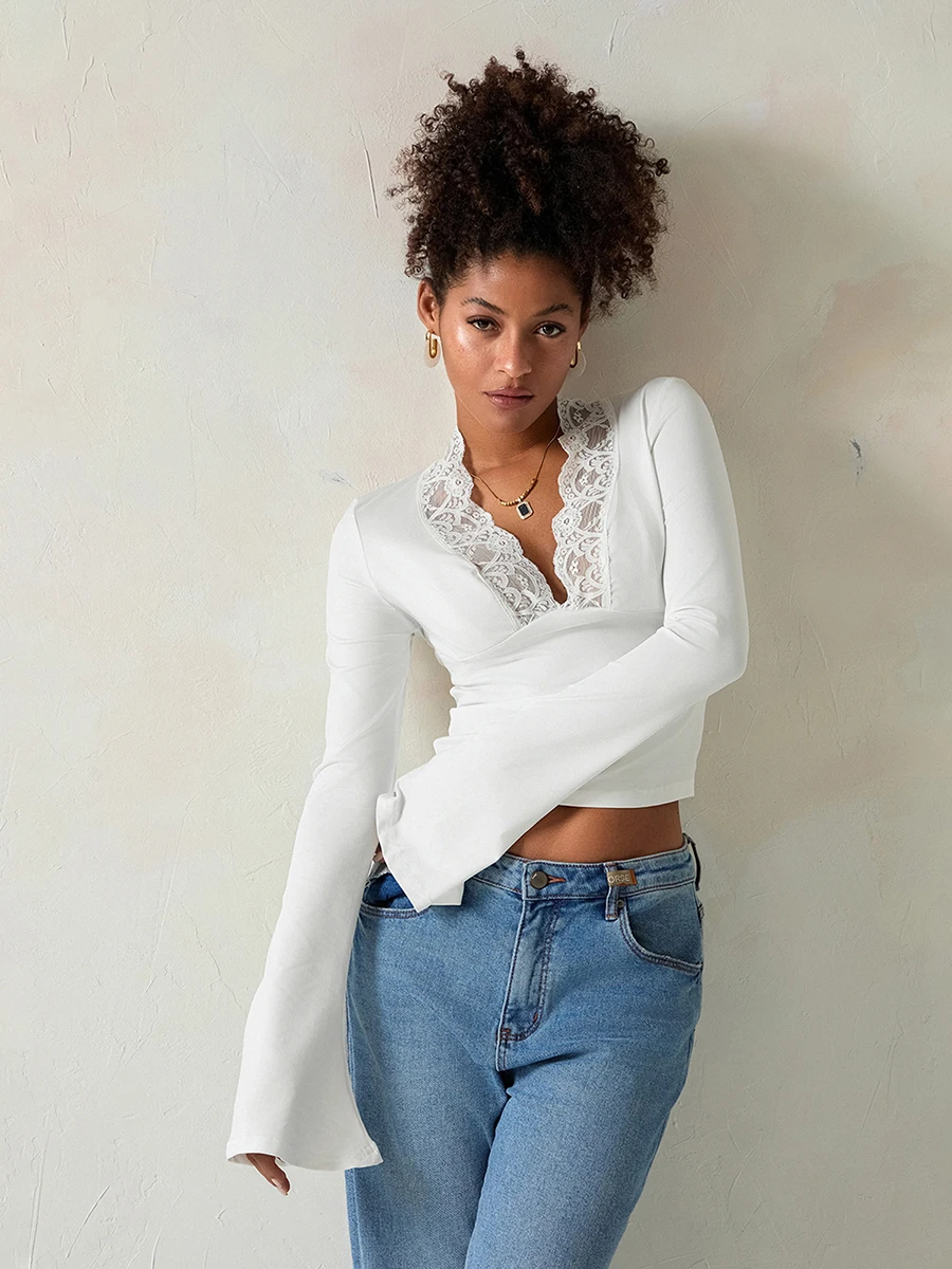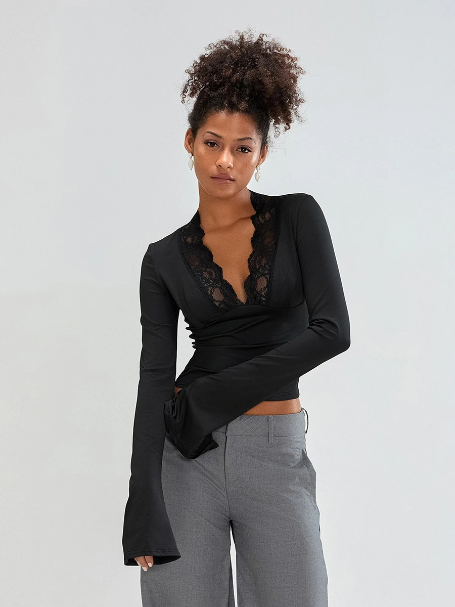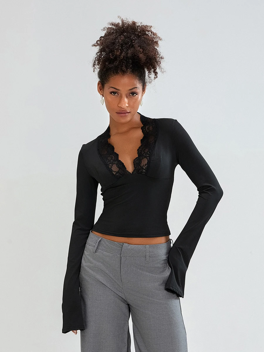 Womens Flare Long Sleeve Tops Sexy Lace Panel Deep V Neck Shirt Elegant Going Out Blouses Tops Streetwear