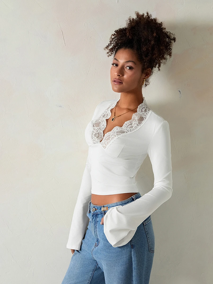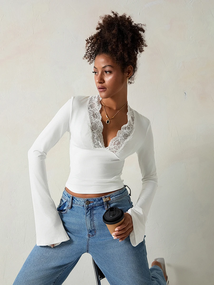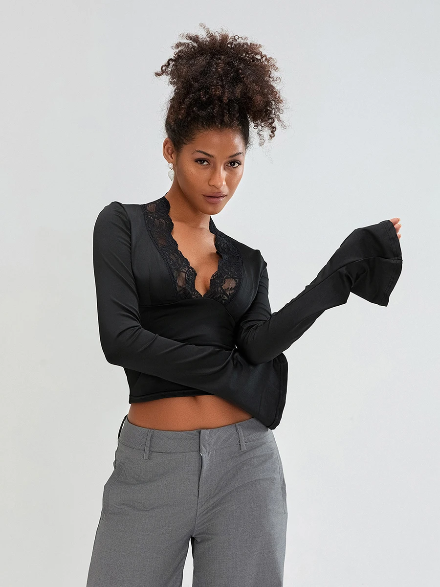 Womens Flare Long Sleeve Tops Sexy Lace Panel Deep V Neck Shirt Elegant Going Out Blouses Tops Streetwear